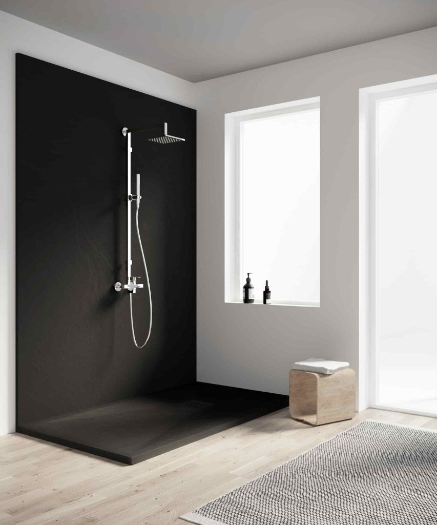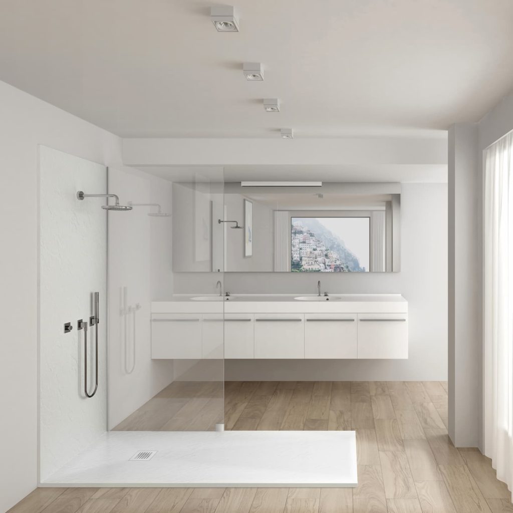 Unique sliding door with fixed panel, suitable for wall to wall recessed installation and Wetroom installations out of the box.