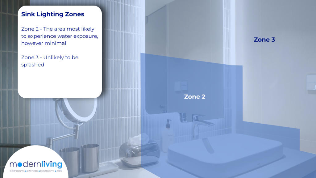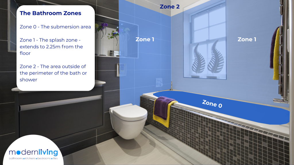 There are three bathroom lighting zones: Zone 1, Zone 2, and Zone 0. Each zone represents a different level of water exposure, accounting for human behaviour and accidents. These are as follows: